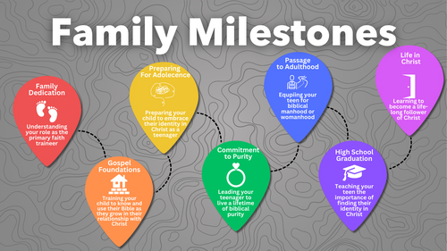 Parents will lead discussions on biblical purity, covering topics such as integrity, relationships, and personal holiness. This milestone encourages students to make a commitment to honor God with their thoughts, words, and actions, particularly in relationships. It often includes a formal commitment or ceremony where young people dedicate themselves to purity in all areas of life.